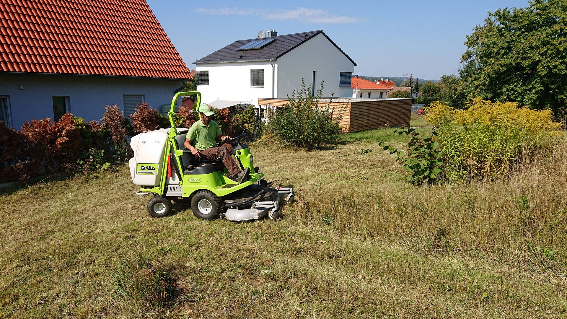 Mit unserem Wiesen- oder Frontmäher können wir auch große Flächen bearbeiten, wie z. B. unbebaute Grundstücke oder Wiesen für unsere privaten Kunden.